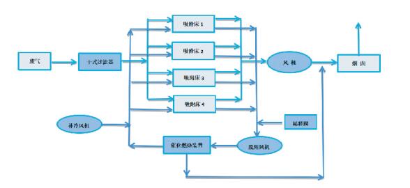 Технические характеристики адсорбционного резервуара и количество загружаемого адсорбента проектируются в соответствии с объемом воздуха, чтобы обеспечить определенную скорость газа и время пребывания, благодаря чему адсорбент может эффективно и полностью поглощать органический растворитель в хвостовом газе. Адсорбционный бак работает попеременно, а рабочее состояние адсорбционного бака автоматически переключается системой автоматического управления ПЛК для попеременного выполнения трех процессов: адсорбции, десорбции, охлаждения и сушки и т. д.