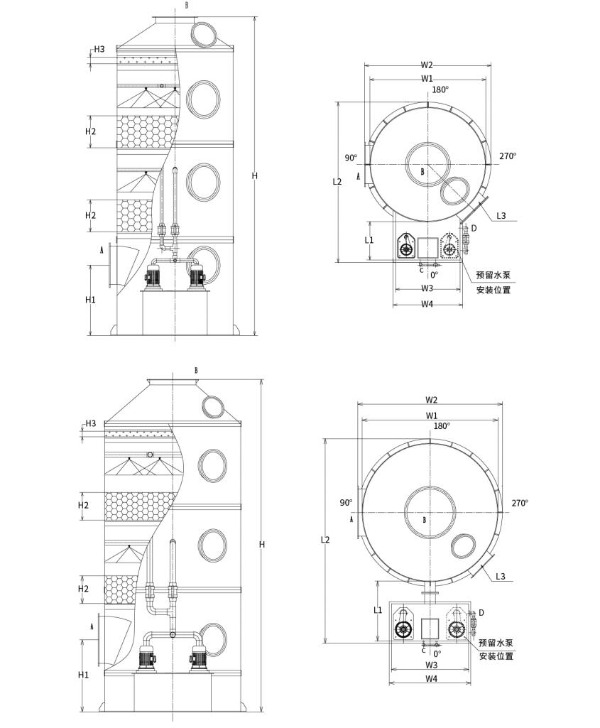 1. Корпус башни: цилиндрический или квадратный герметичный контейнер, служащий основным пространством для реакции между выхлопными газами и абсорбентом. Обычно он оснащен насадочным слоем (например, кольцами Палля, полыми шариками или кольцами Рашига) для увеличения площади контакта газа и жидкости.